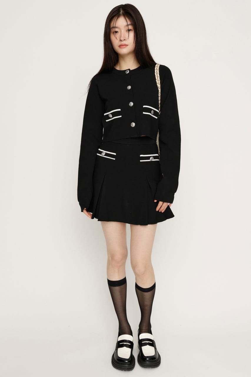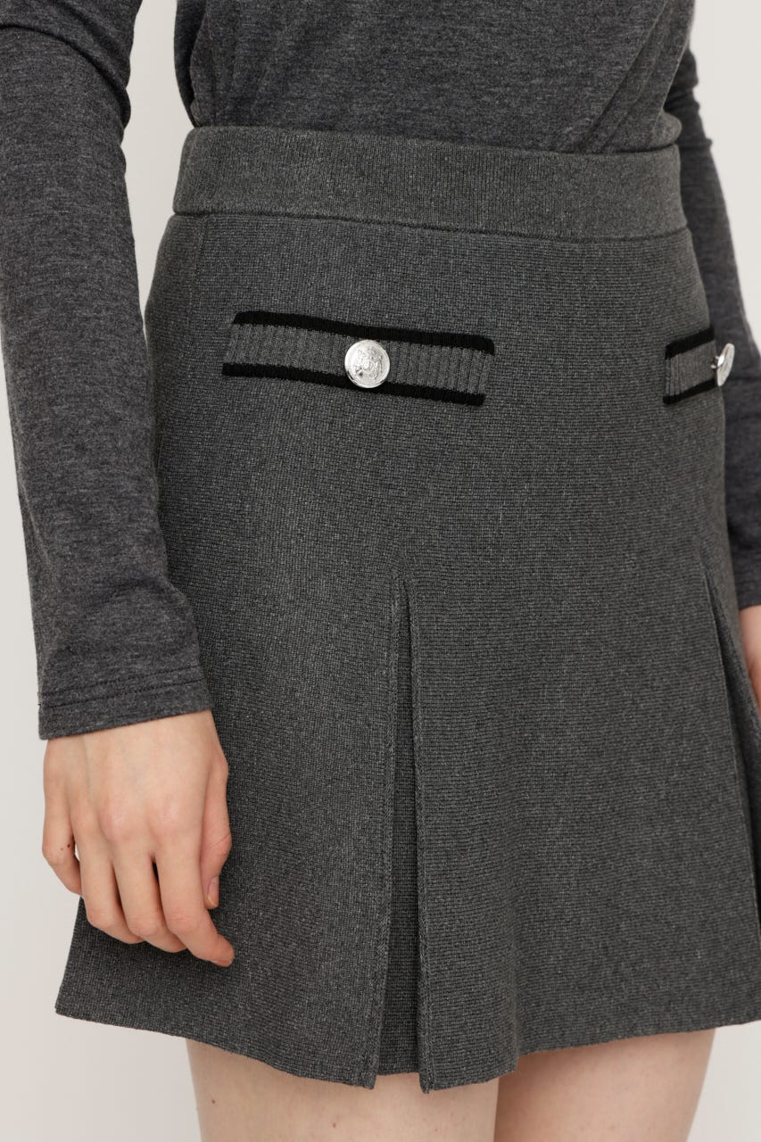 ウエスト位置に配したバイカラーデザインとエンブレム柄の脚付き釦が目を引くスカート。
