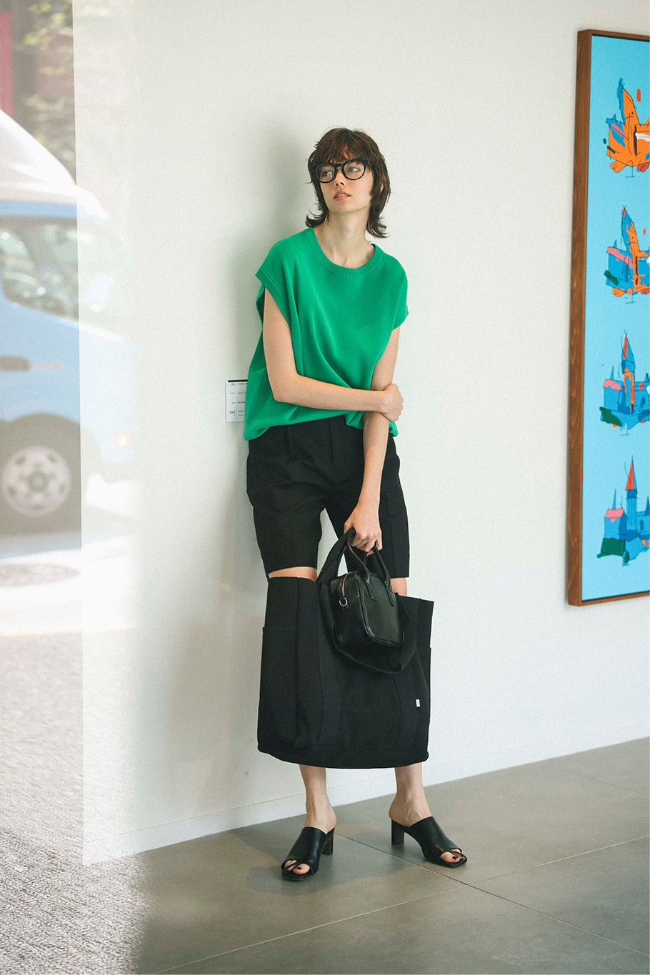- グリーンのテンションを落ち着かせる、ニット素材とボトムスの黒。 余白に包まれたニットを引き締めるためにも、細みなハーフパンツというバランスは正解。 大ぶりなバッグで、ミニマムなシルエットに抑揚をつけて。