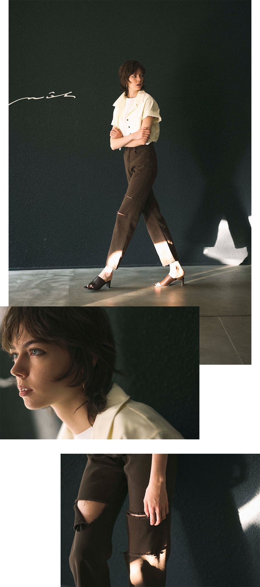 - ブルーデニムのかわいさもいいけれど、きちんと見せるブラウンでつつましく気分転換。ダメージヘムから垣間見える素足で、まじめな上下の息抜きを。