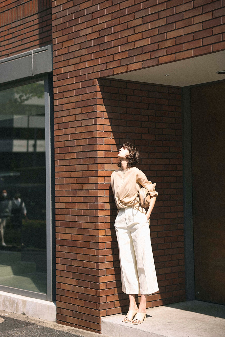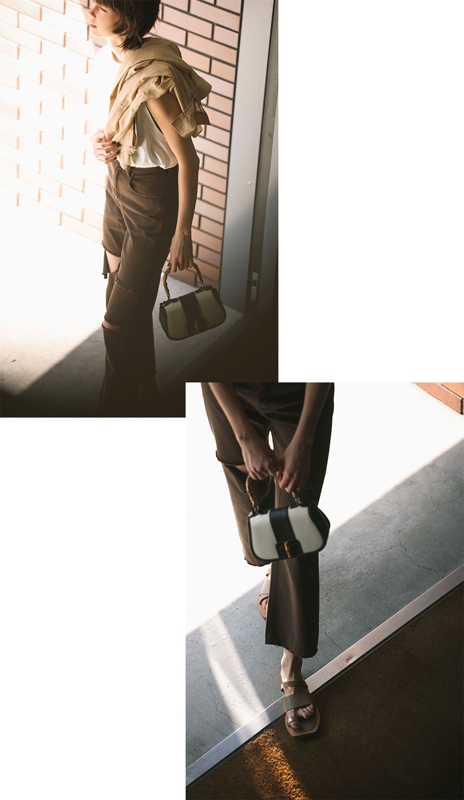 - 白タンクとデニムのあからさまなカジュアルも、知性を語る首の詰まりや穏やかなブラウンを 味方につけてスマートな装いに転身。手に持ったシャツのベージュが、 配色のコントラストの中和役。