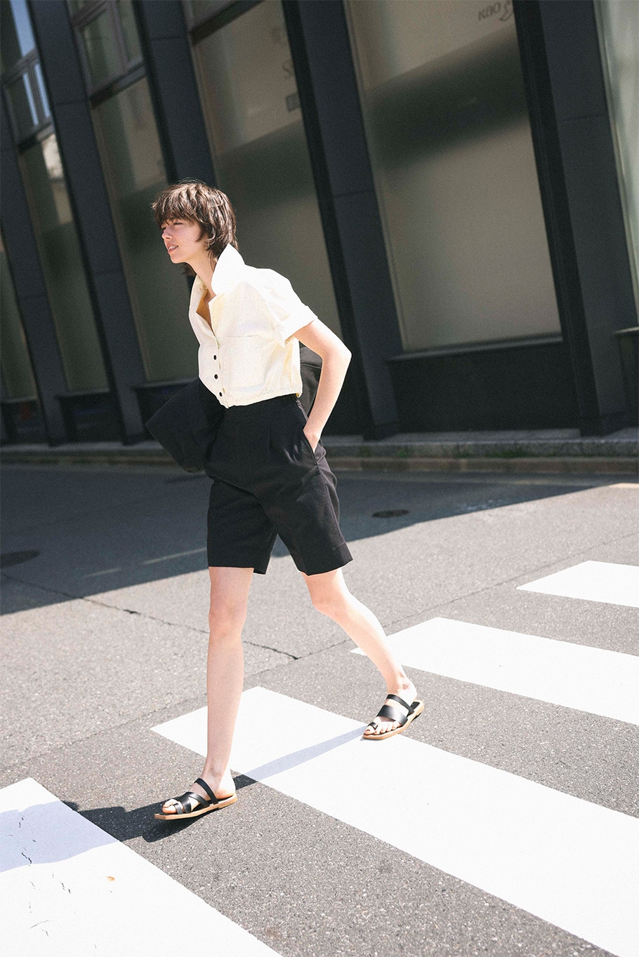 - クロップド丈のブラウスにハーフパンツという短い丈同士を、モノトーンで切れ味よく。 目線が上がることでスタイルよく見えるのはもちろん、脚出しや高い腰位置でメンズっぽい上下に 女性らしいニュアンスが生まれる。