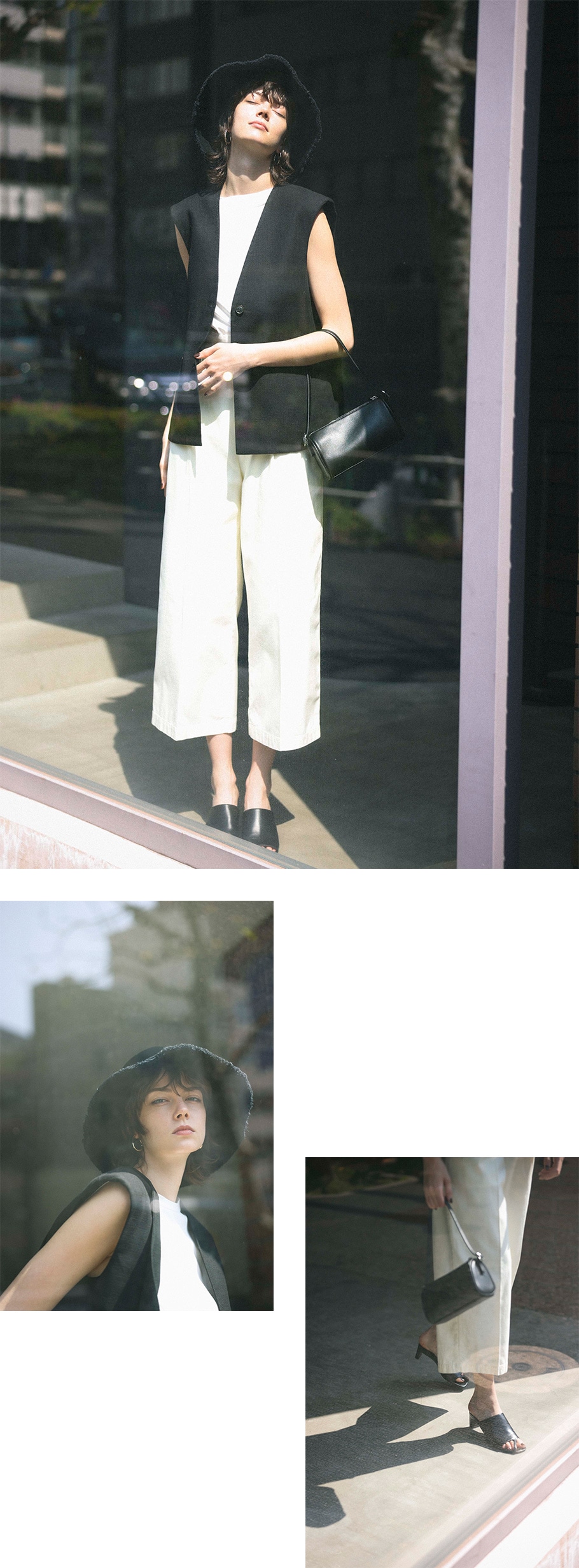 - はおるだけで縦長を強調できる、ハンサムなノースリーブのジレ。 目線アップに効果的なハットや縦伸びするセンタープレス入りパンツでとことんたてのラインを意識。 インナーを白でつなげればさらにシャープ。