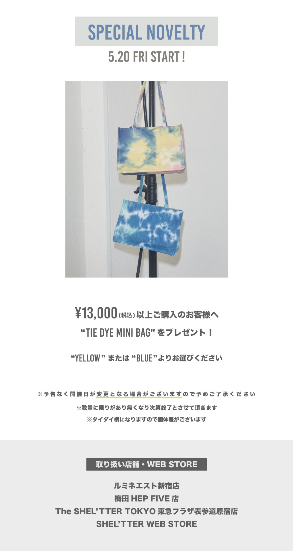 - ※5.20(金)12:00からSHEL'TTER WEB STOREにてLAGUA GEMの商品を一回のご注文で、¥13000(税込・送料/手数料別)以上購入して頂いたお客様に「TIE DYE MINI BAG」をプレゼント致します。