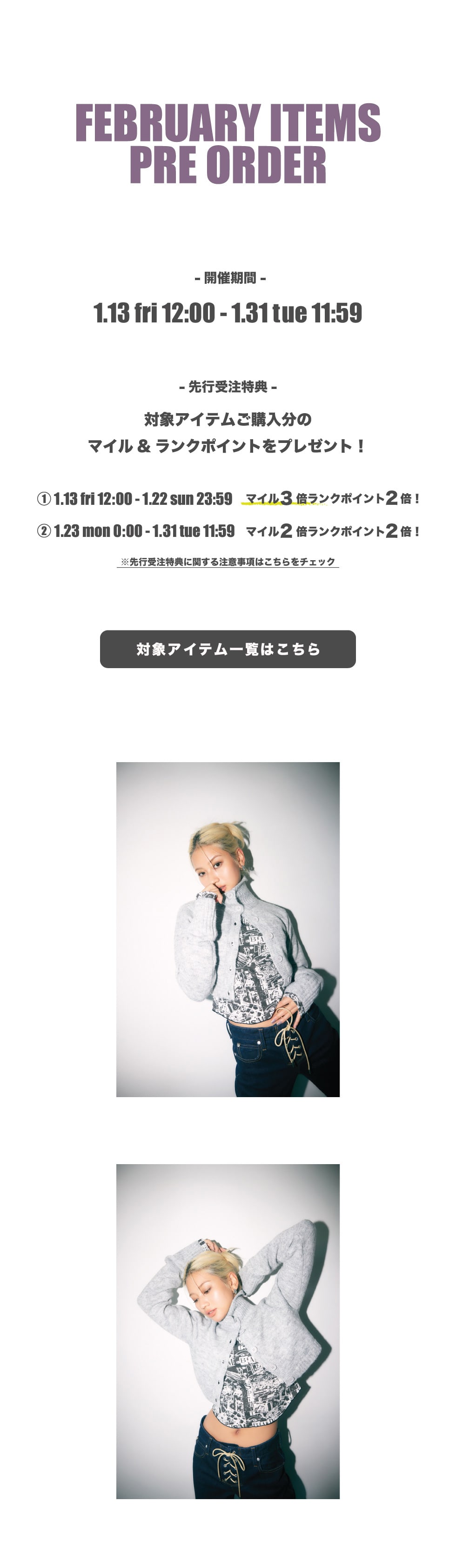 - 対象期間中(1/23(月)00:00~1/31(火)11:59)にご購入の受注会対象アイテムのマイルが2倍、ランクポイントが2倍で付与されます。