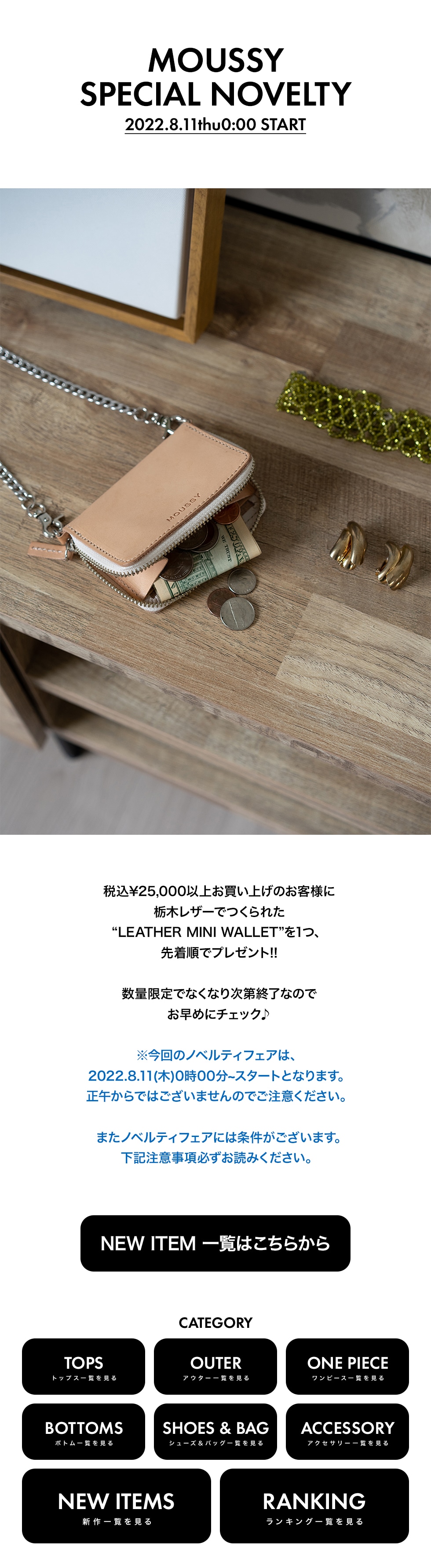 ※8.11(木)0:00からSHEL'TTER WEB STOREにてMOUSSY・MOUSSY STUDIOWEAR・Disney SERIES CREATED by MOUSSY の商品を1回のご注文で税込25,000円以上ご購入して頂いたお客様に「LEATHER MINI WALLET」をプレゼント致します。