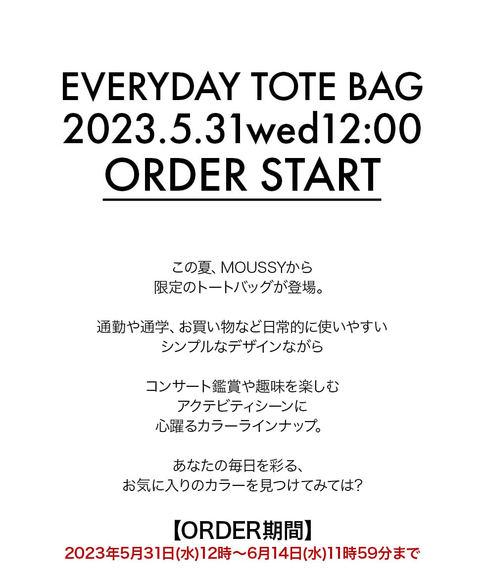 - ※5.31(水)12:00からSHEL'TTER WEB STOREにて010GA51-6710 MOUSSY EVERYDAY TOTE BAG を一回のご注文で、1点以上購入して頂いたお客様に「MOUSSY CLEAR POUCH」を1点プレゼント致します。