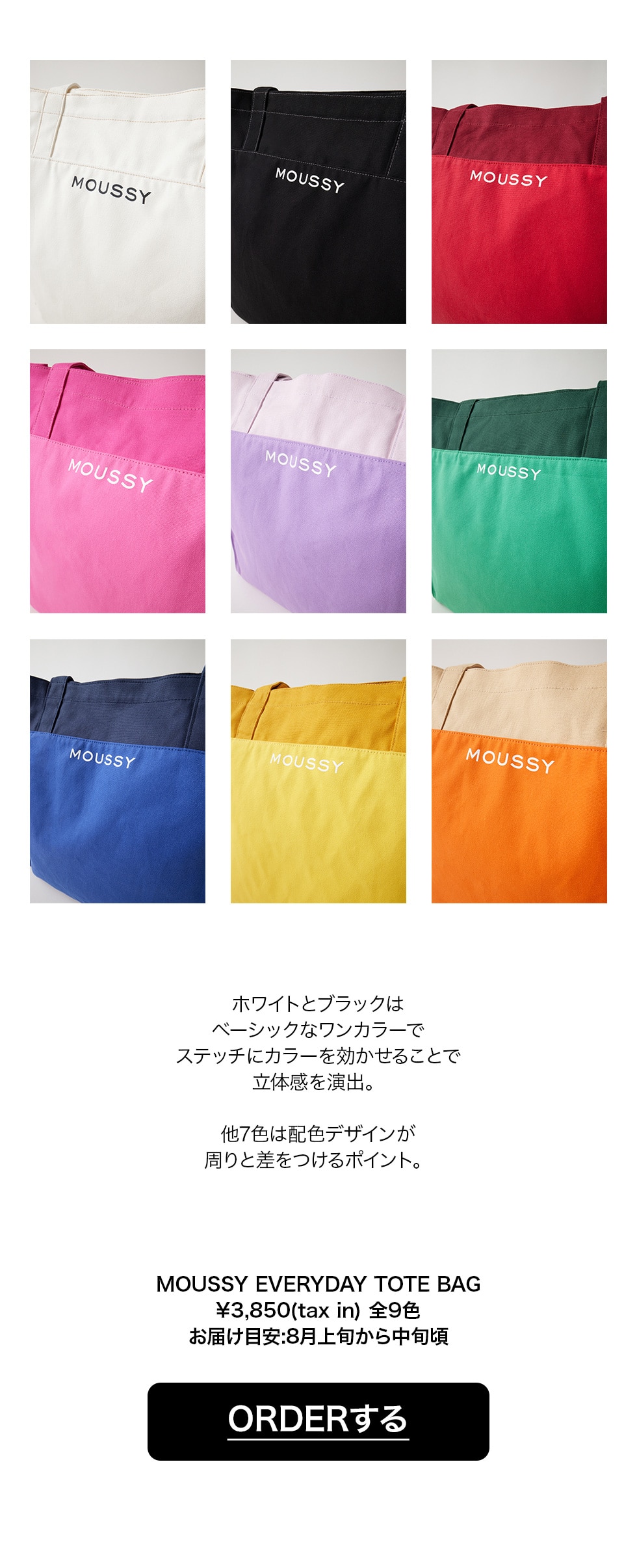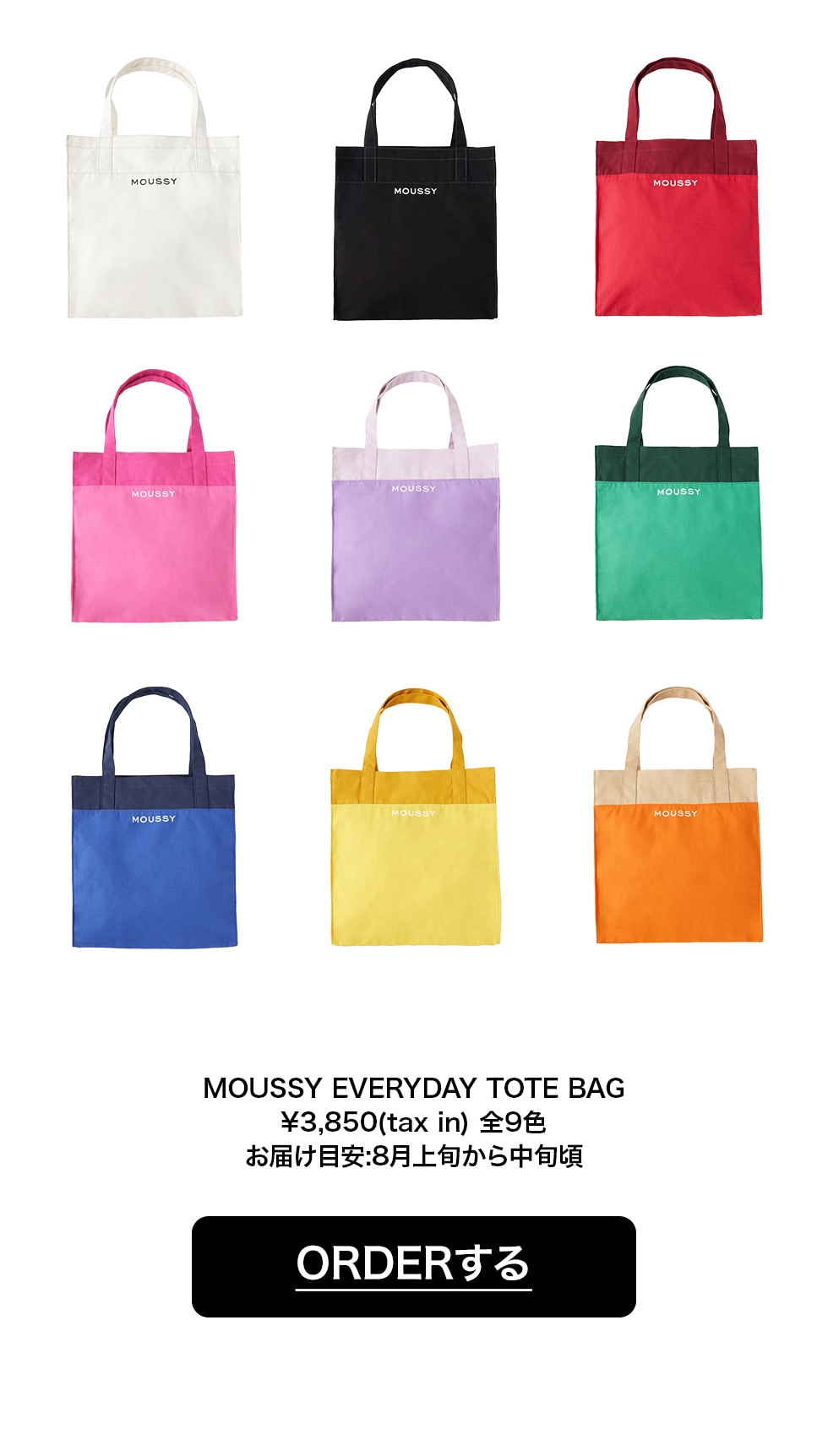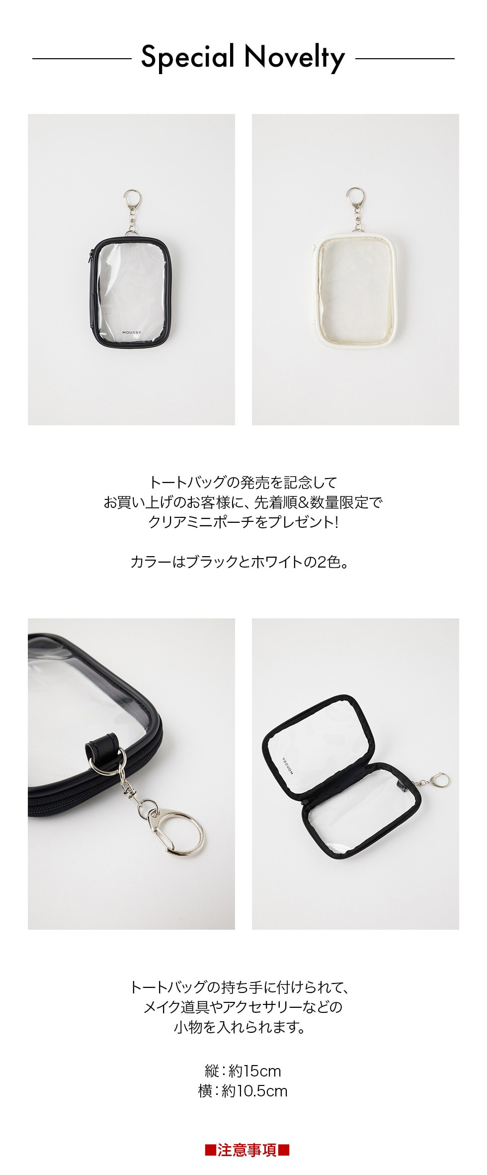 - ※ノベルティの「MOUSSY CLEAR POUCH」のBLACK・WHITE どちらか1色を選択頂きます。(どちらかのカラーが終了した場合は、選択はできません)