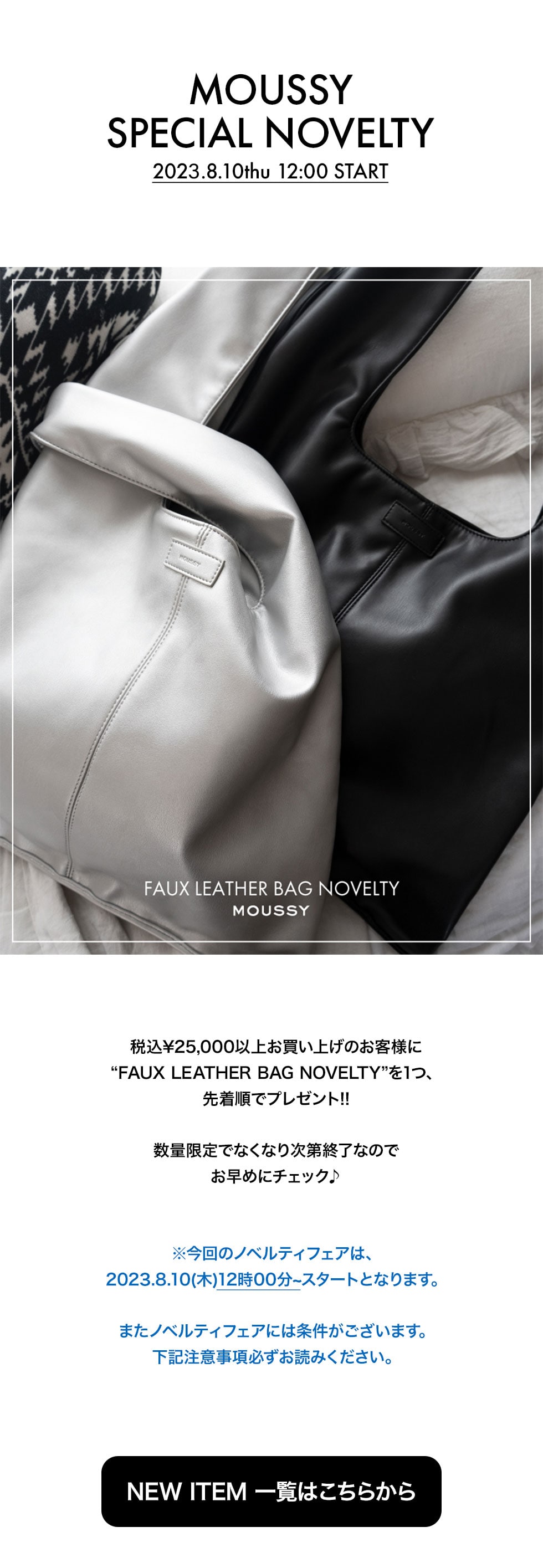 ※8.10(木)12:00からSHEL'TTER WEB STOREにてMOUSSY・M_・Disney SERIES CREATED by MOUSSY・LOVUS gallery・MOUSSY STUDIOWEAR の商品を一回のご注文で、¥25,000(税込・送料/手数料別)以上購入して頂いたお客様に「FAUX LEATHER バッグ」を1点プレゼント致します。