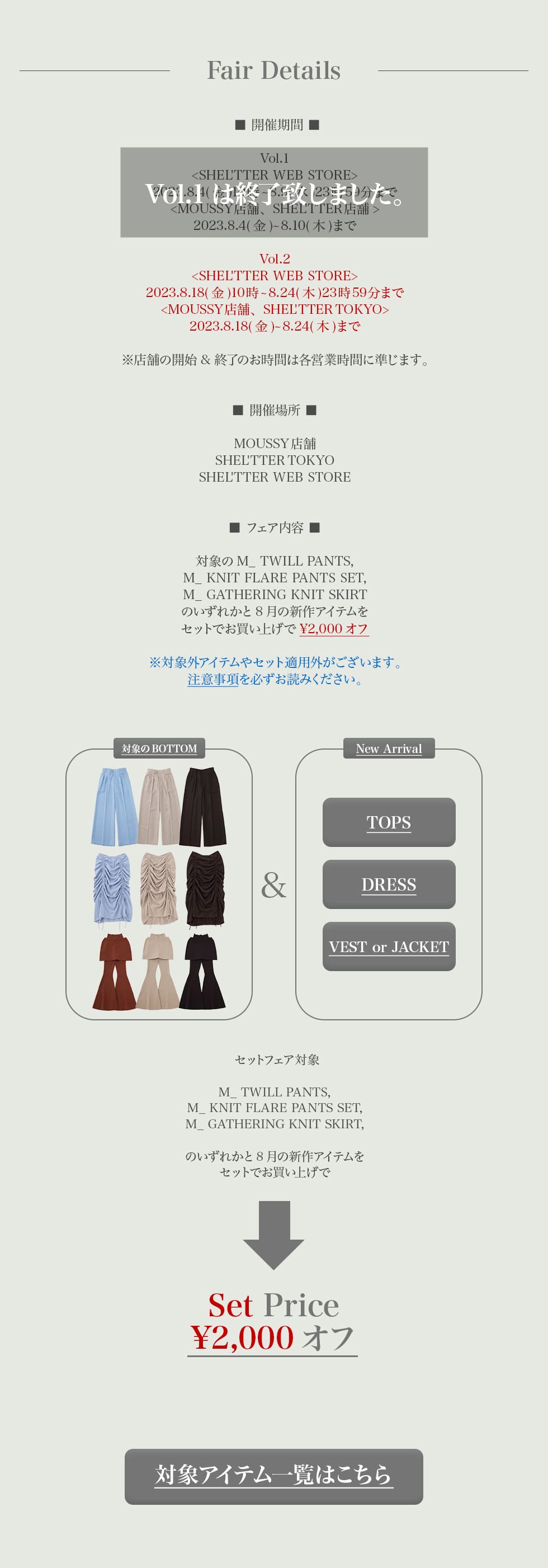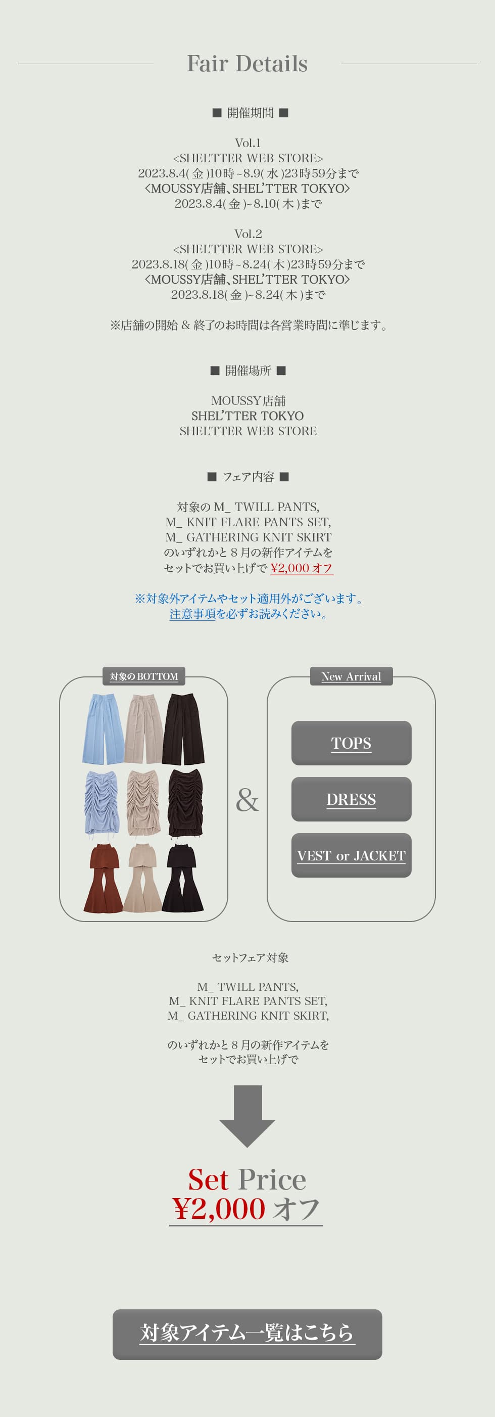- ※対象のボトムスと対象の8月新作商品を各1点ずつセットのご注文で、対象の8月の新作商品が2,000円OFFとなります。