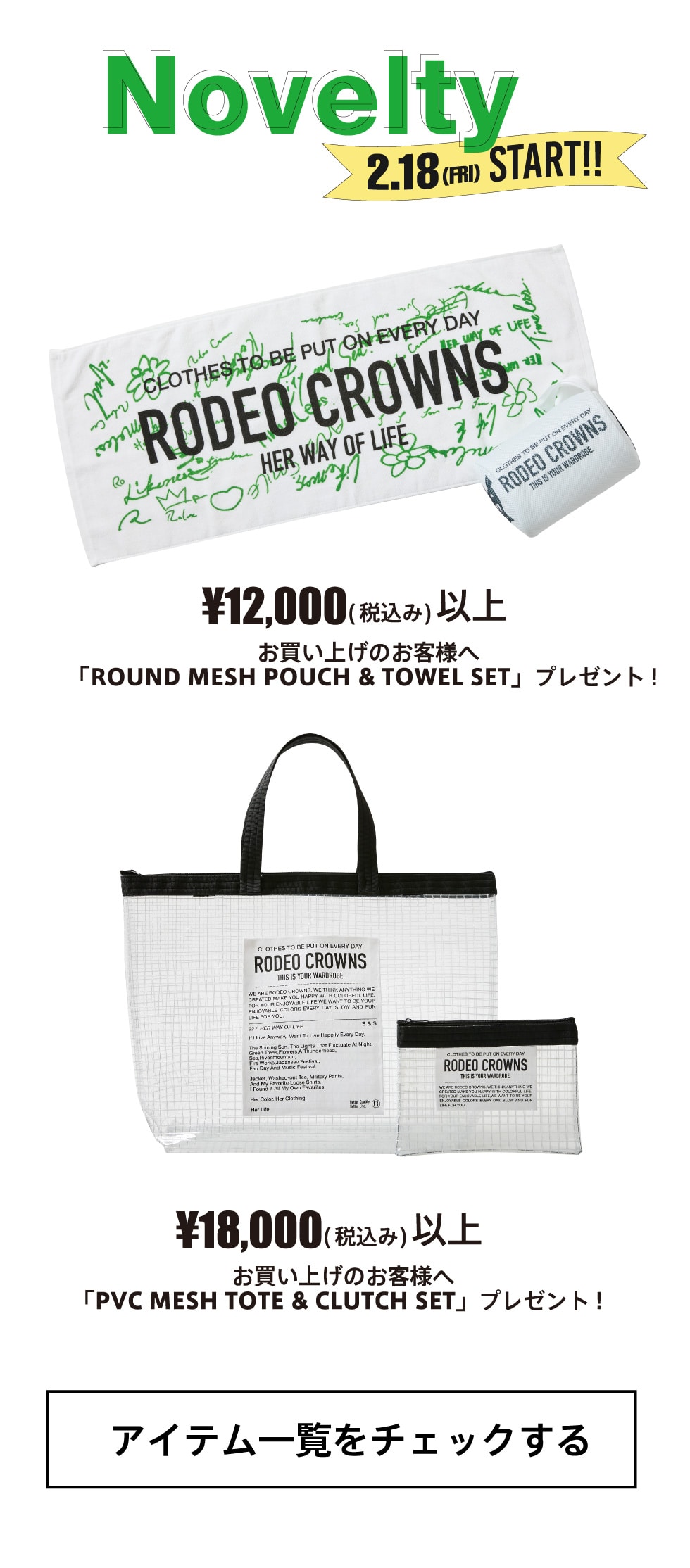 - ※2.18(金)12:00からSHEL'TTER WEB STOREにてRODEO CROWNS WIDE BOWLの商品を一回のご注文で、¥12,000(税込・送料/手数料別)以上購入して頂いたお客様に「ROUND MESH POUCH & TOWEL SET」、¥18,000(税込・送料/手数料別)以上購入して頂いたお客様に「PVC MESH TOTE & CLUTH SET」をプレゼント致します。