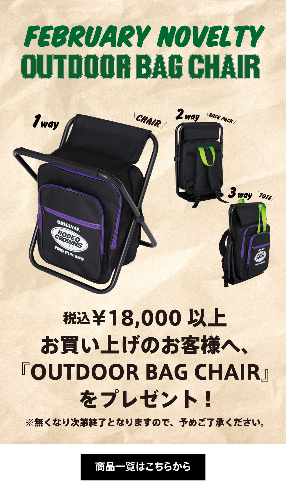 - ※2.10(金)12:00からSHEL'TTER WEB STOREにてRODEO CROWNS WIDE BOWLの商品を一回のご注文で、¥18,000(税込み・送料/手数料別)以上購入して頂いたお客様に「OUTDOOR BAG CHAIR」をプレゼント致します。