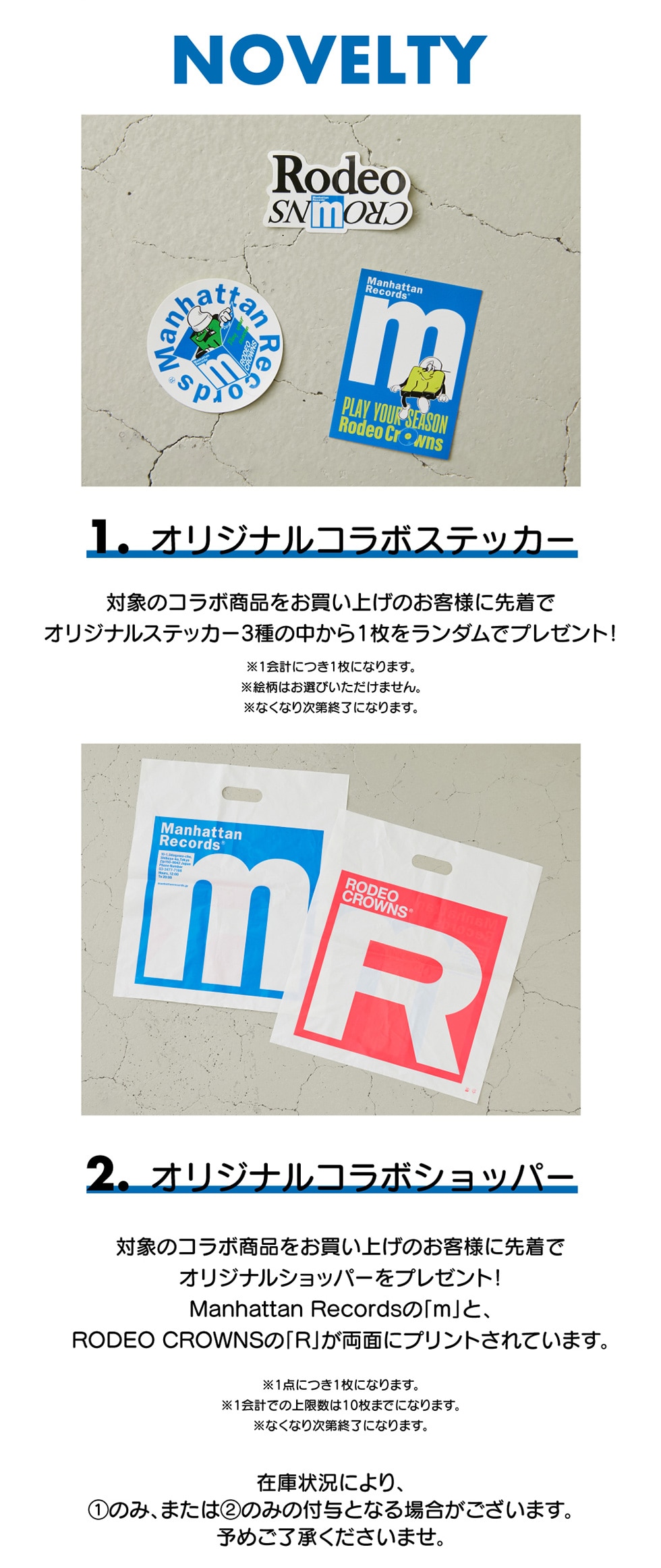 - ※2.9(金)12:00からSHEL'TTER WEB STOREにてRODEO CROWNS WIDE BOWLの対象コラボ商品をご購入して頂いたお客様に「オリジナルコラボステッカー(ランダム)」と「オリジナルコラボショッパー」をプレゼント致します。