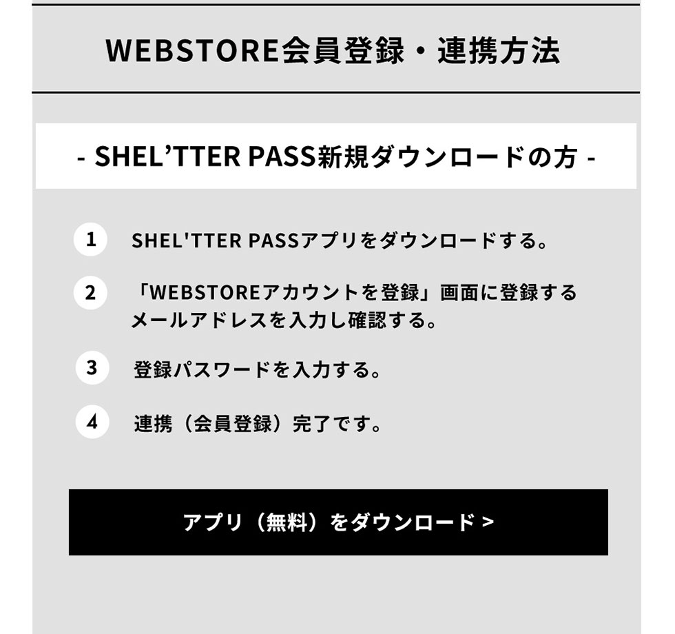 店舗ご利用の場合: SHEL'TTER PASSダウンロードはこちら>