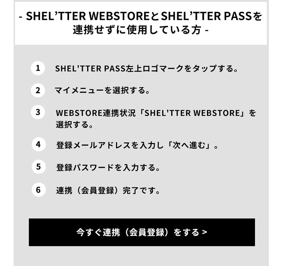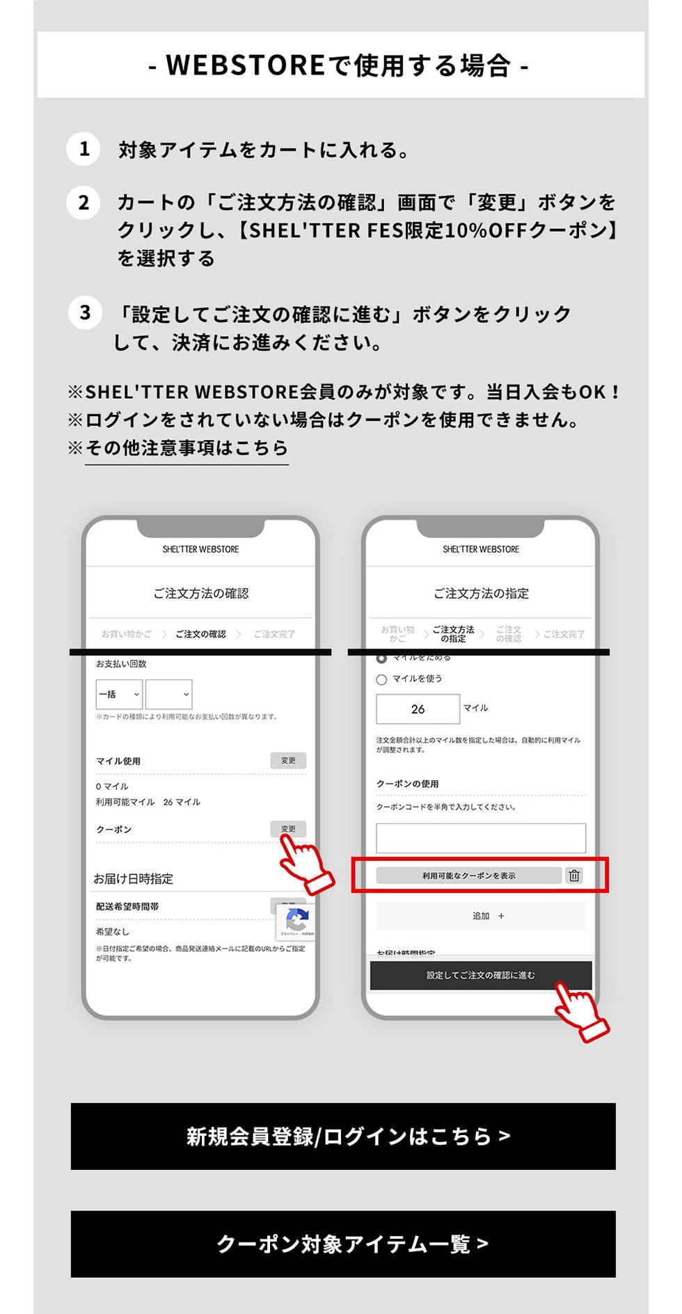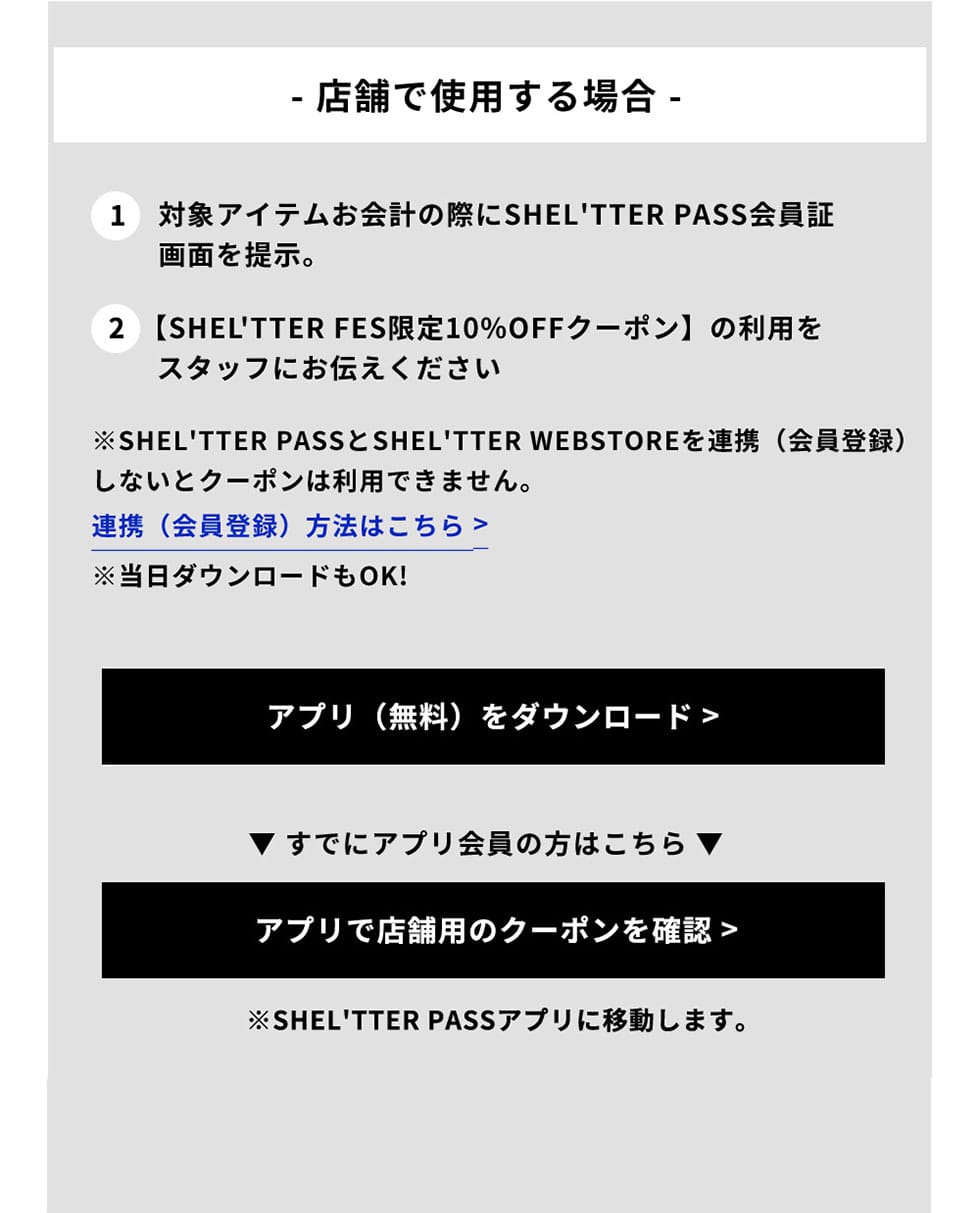 SHEL'TTER WEBSTORE と SHEL'TTER PASSを連携 (会員登録) されていない方はクーポンは使用できません。