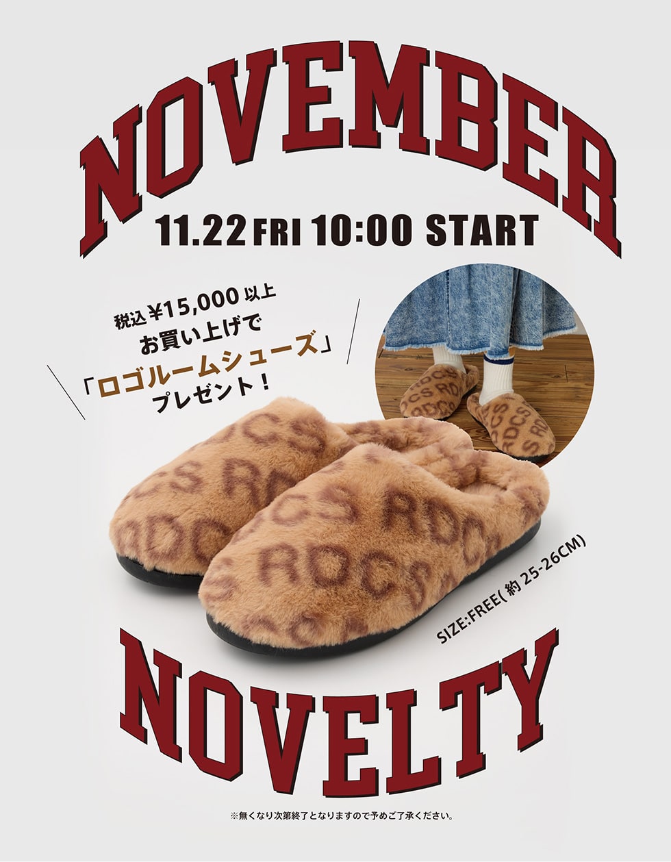 - ※11.22(金)10:00からSHEL'TTER WEB STOREにてRODEO CROWNS WIDE BOWLの商品を一回のご注文で、¥15000(税込・送料/手数料別)以上購入して頂いたお客様に「ロゴルームシューズ」をプレゼント致します。