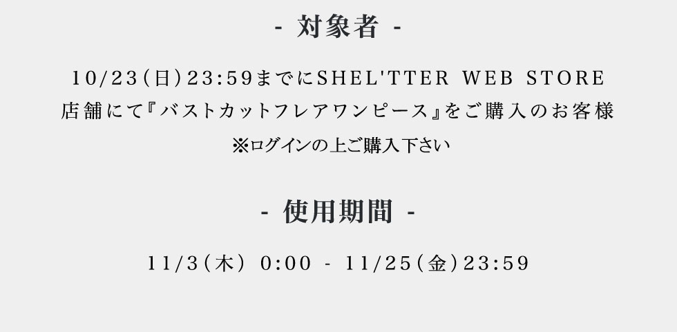 - ※SHEL‘TTER PASS APPの会員登録とSHEL‘TTER WEB STOREとの連携がお済みの方が対象となります。