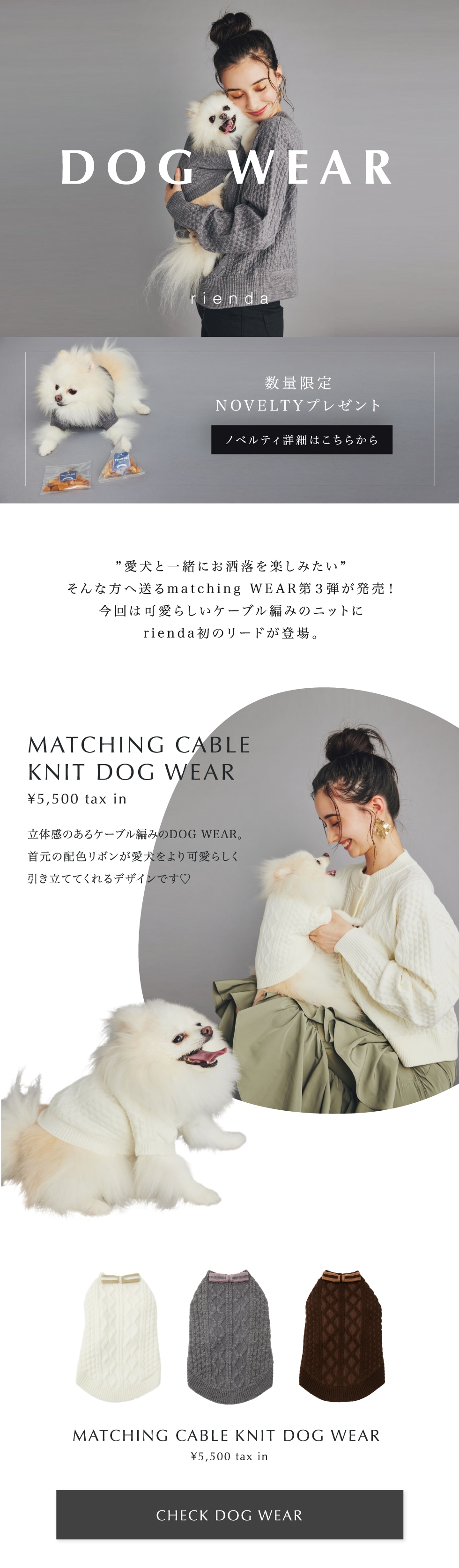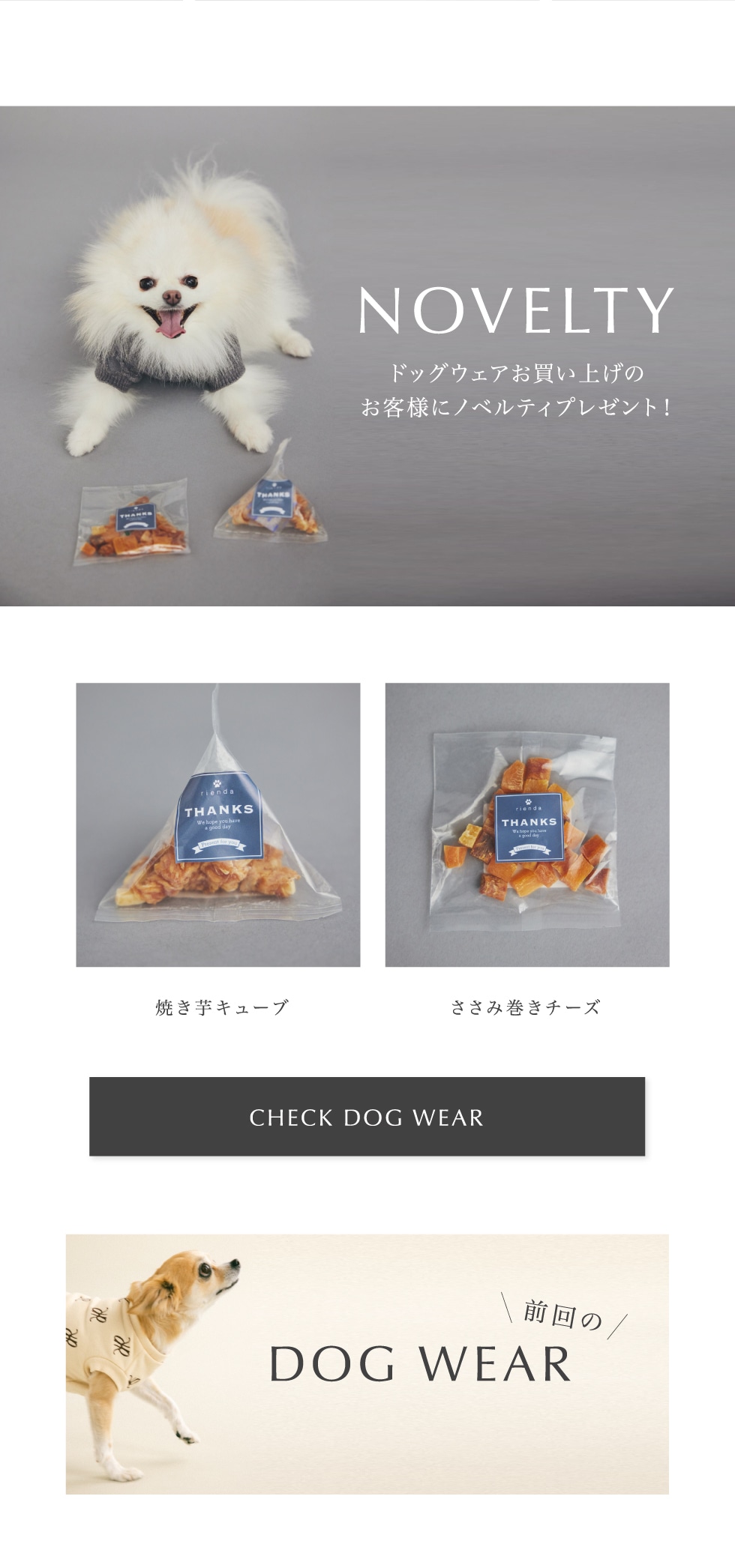 - ※10.21(金)12:00からSHEL'TTER WEB STOREにて対象のDOGウェア・アクセサリーをご購入して頂いたお客様に「dog treats」をプレゼント致します。