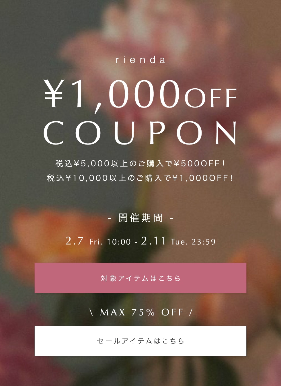 ※クーポンは2種類(税込み10,000円以上で1,000円、5,000円以上で500円)お買い上げ金額は全て税込になります。