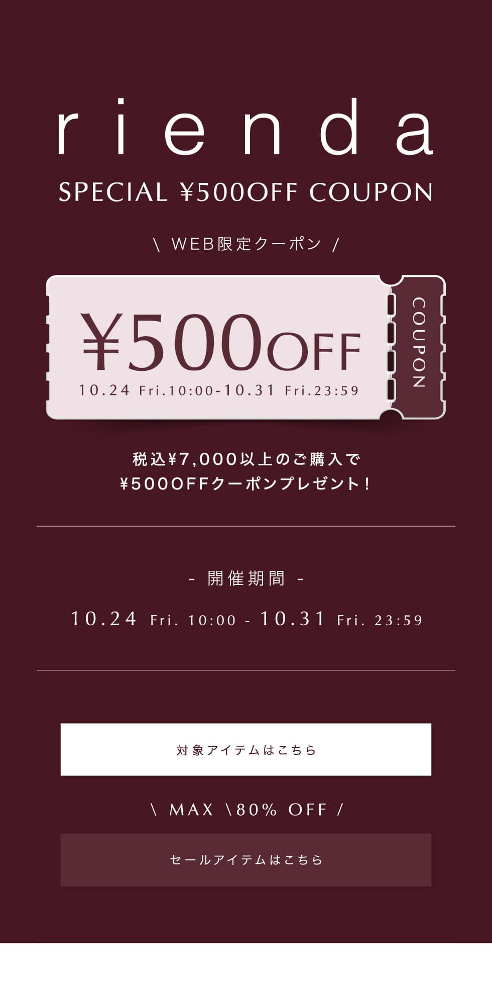 - ※クーポンのご利用期間は10/24(金)10:00~10/31(金)23:59までとなります。