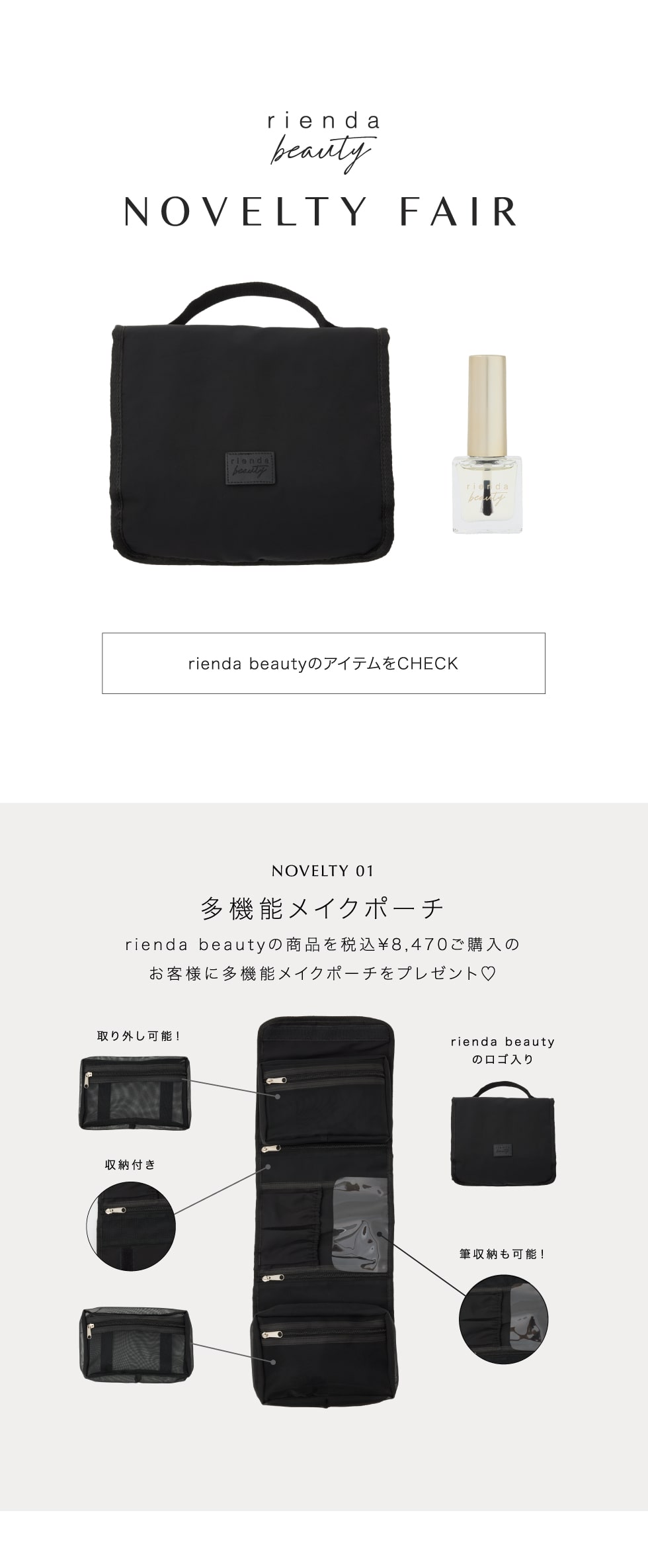 - ※08.18(金)10:00からSHEL'TTER WEB STOREにてriendabeautyの商品を一回のご注文で、¥8,470(税込・送料/手数料別)以上購入して頂いたお客様に「rienda beautyマルチポーチ」をプレゼント致します。
