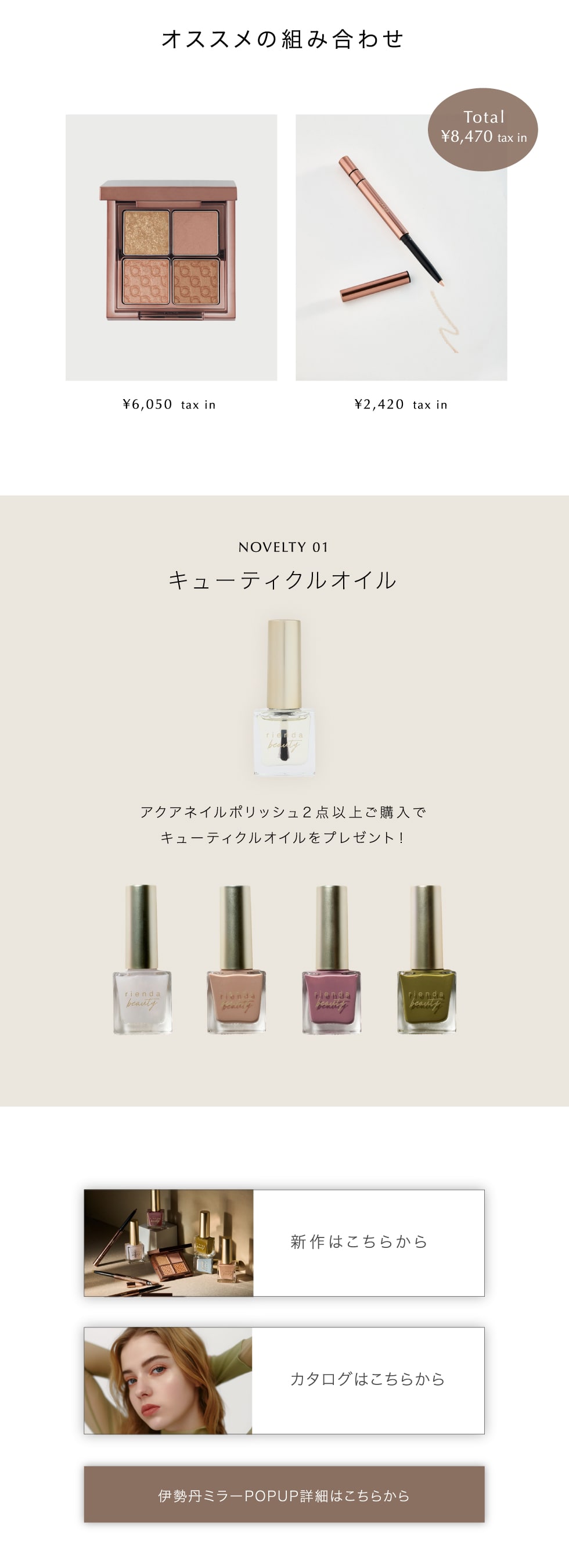 - ※08.18(金)10:00からSHEL'TTER WEB STOREにてriendabeauty「アクアネイルポリッシュ」を一回のご注文で2点以上購入して頂いたお客様に「rienda beautyキューティクルオイル」を1点プレゼント致します。