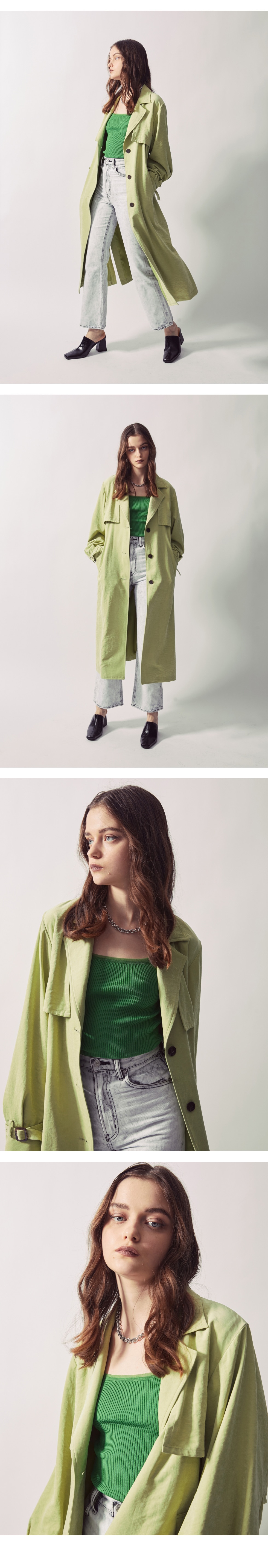 ピスタチオ系のグリーンカラーで羽織るだけで旬コーデに。