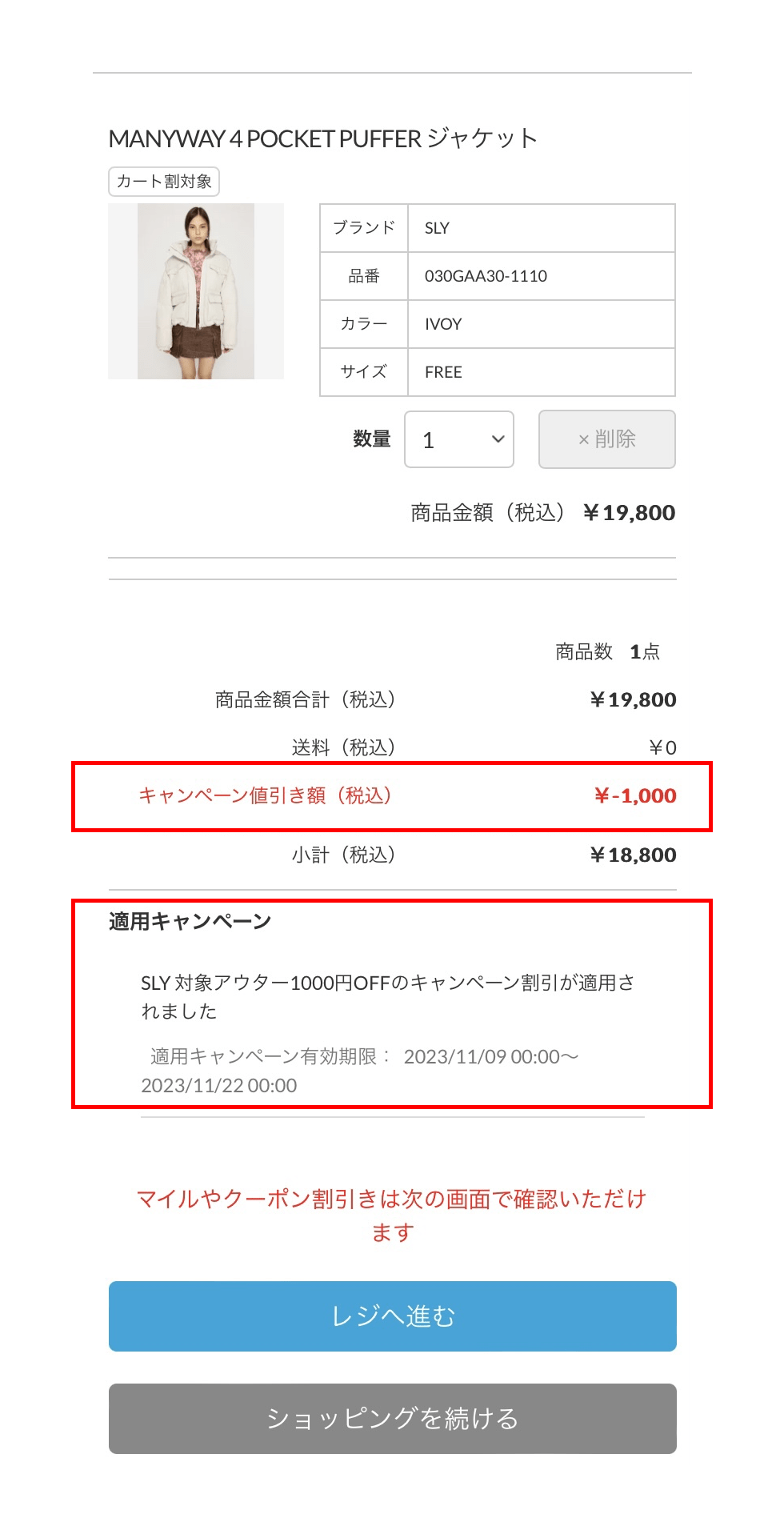 2.カートに商品が追加後「キャンペーン値引額」と