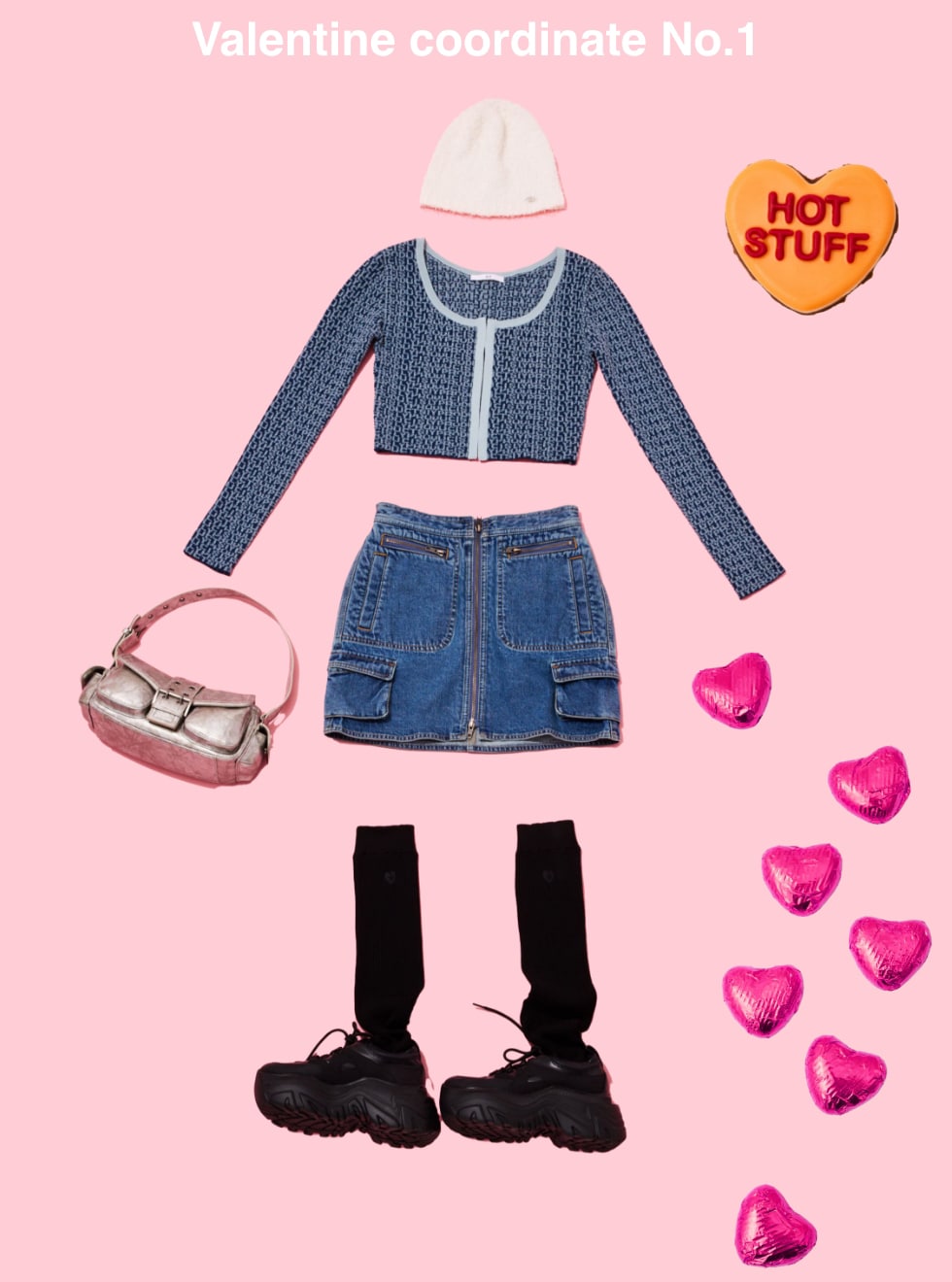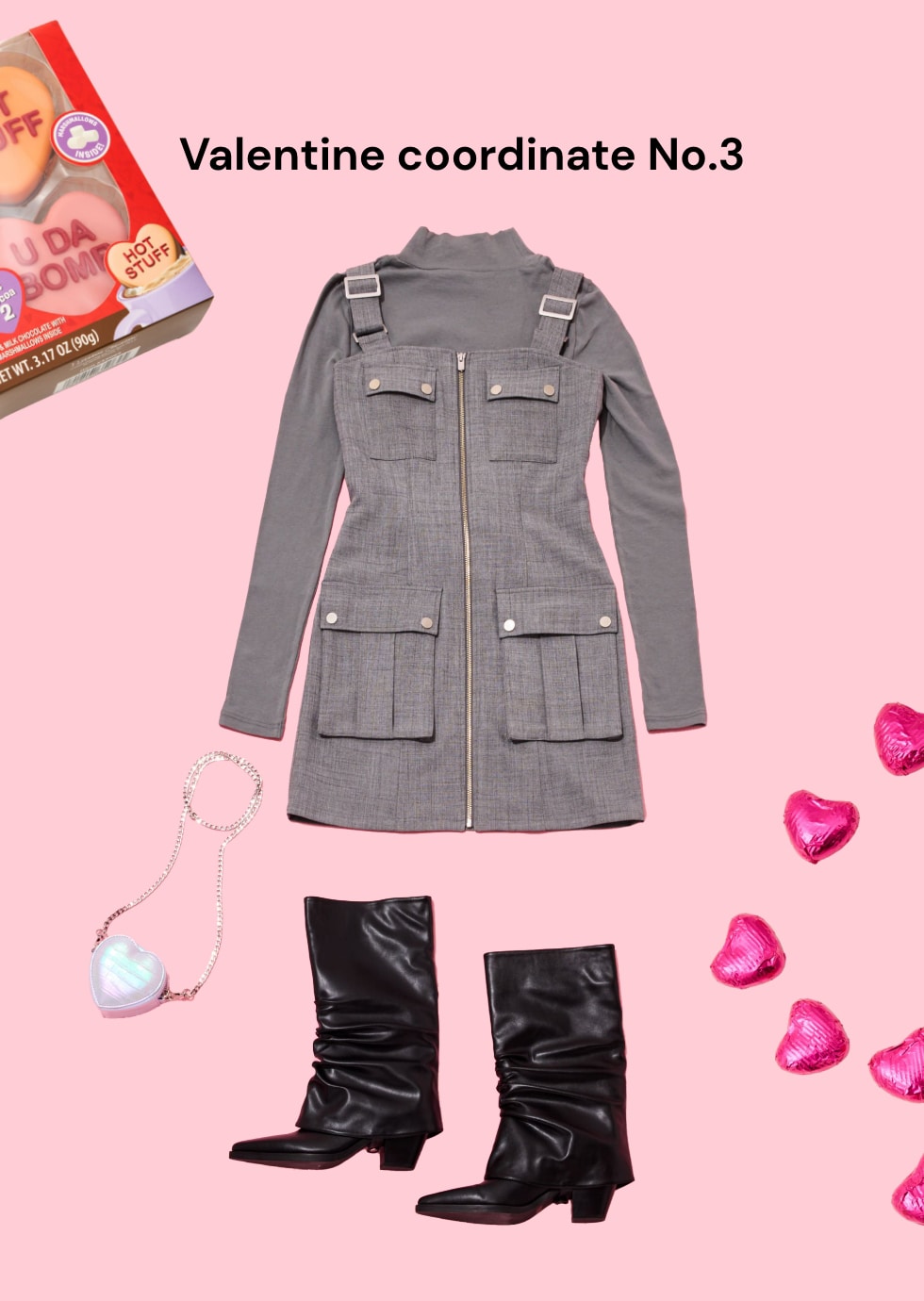Coordinate point 綺麗なシルエットのワンピースは グレーでまとめる事でシックな印象に。 ハートのポーチをプラスする事でバレンタインムードを演出。
