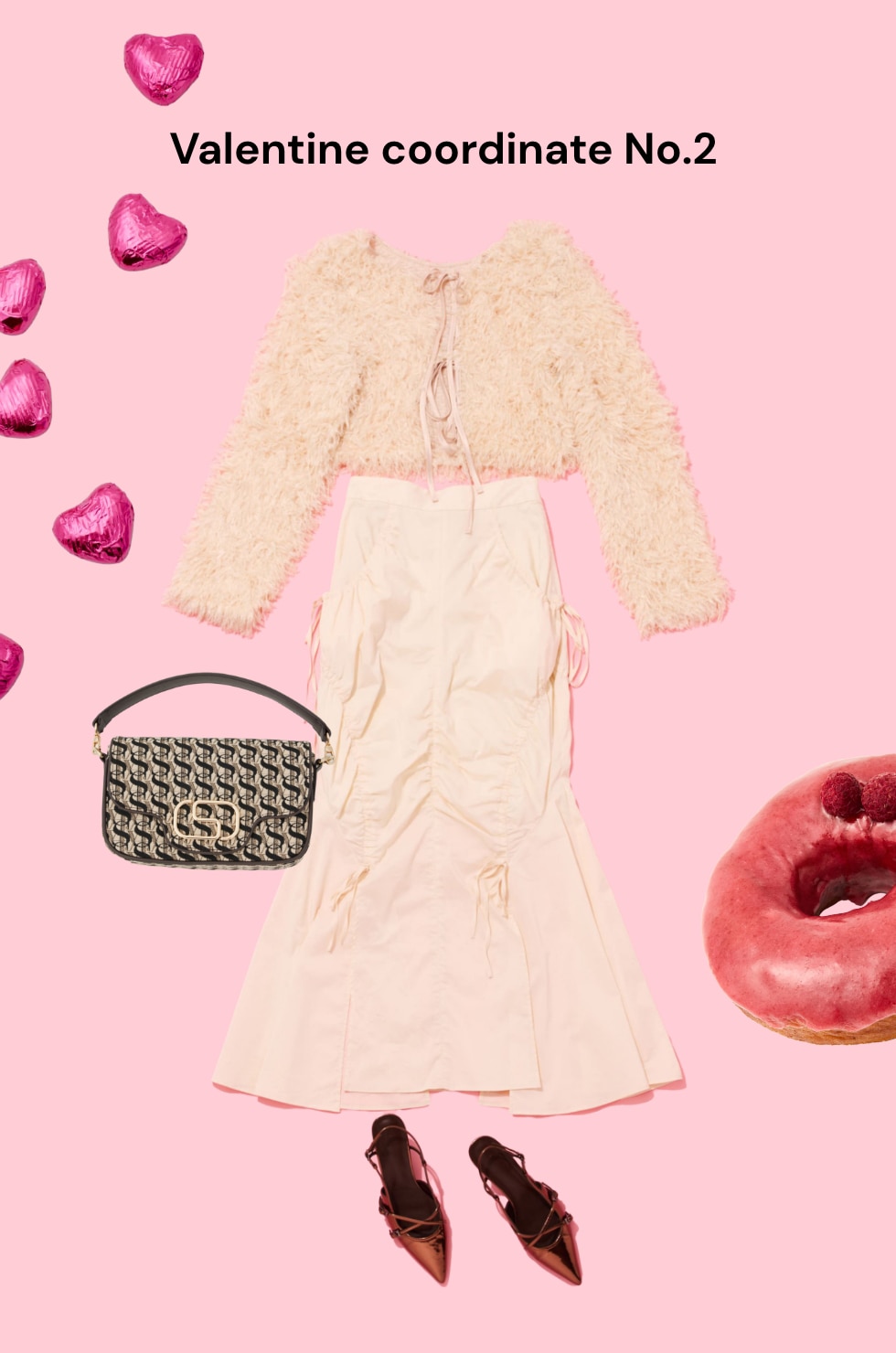 Coordinate point 思わず触りたくなるような質感のトップスは ギャザースカートと合わせる事で王道ガーリーコーデの完成。 ふんだんに散りばめられたリボンディティールはトレンド感もプラス。