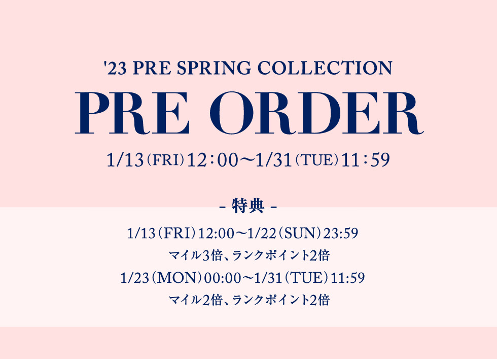 - 対象期間中(1/13(金)12:00~1/22(日)23:59)にご購入の受注会対象アイテムのマイルが3倍、ランクポイントが2倍で付与されます。
