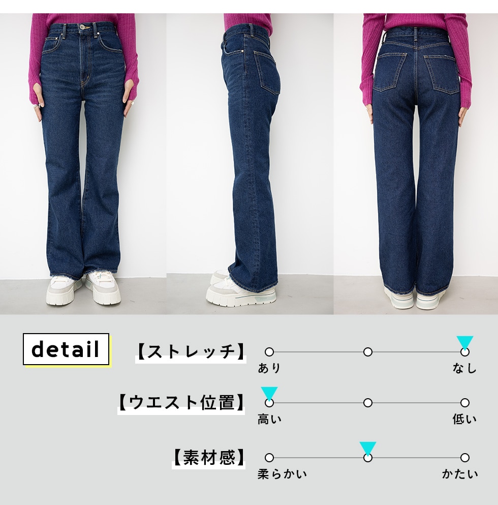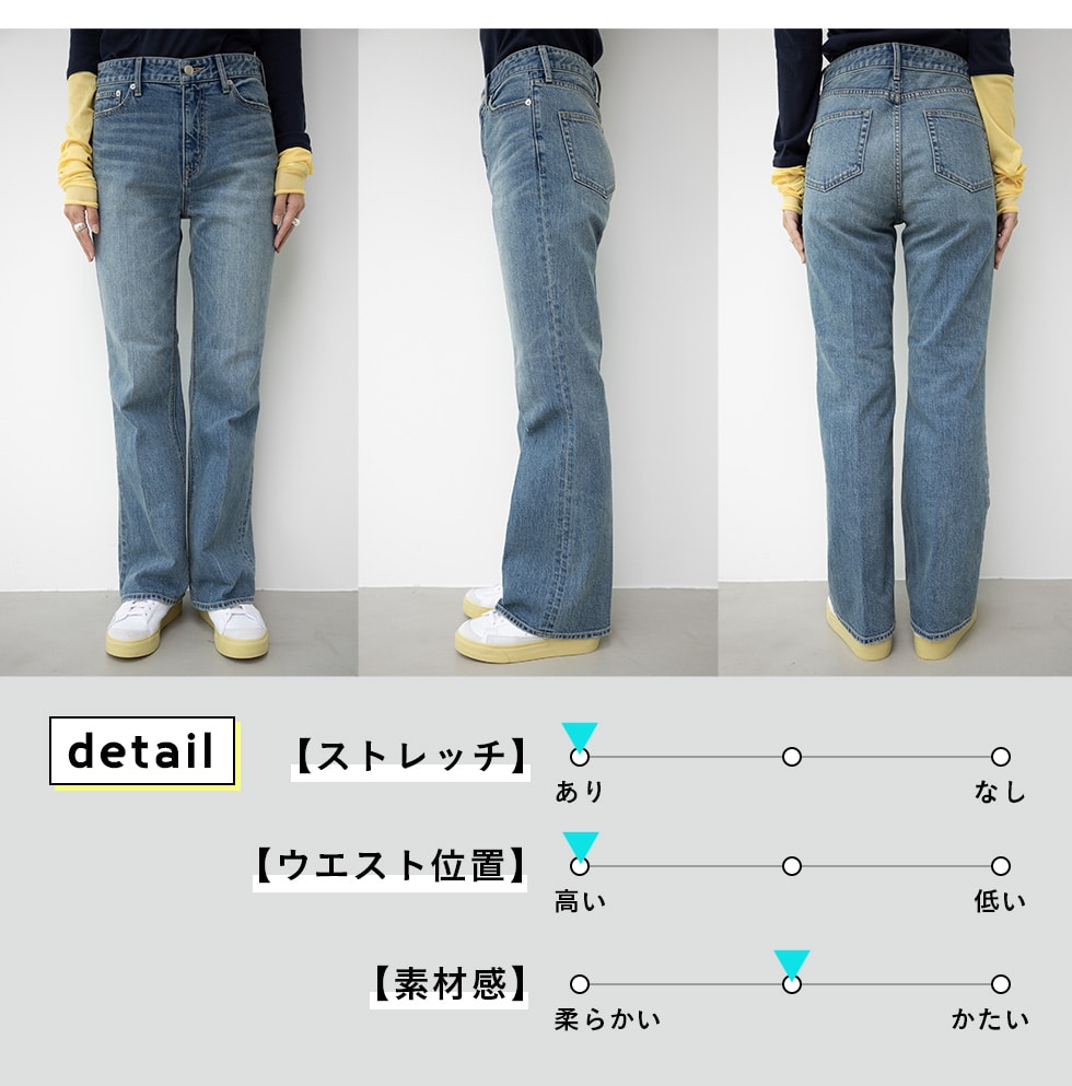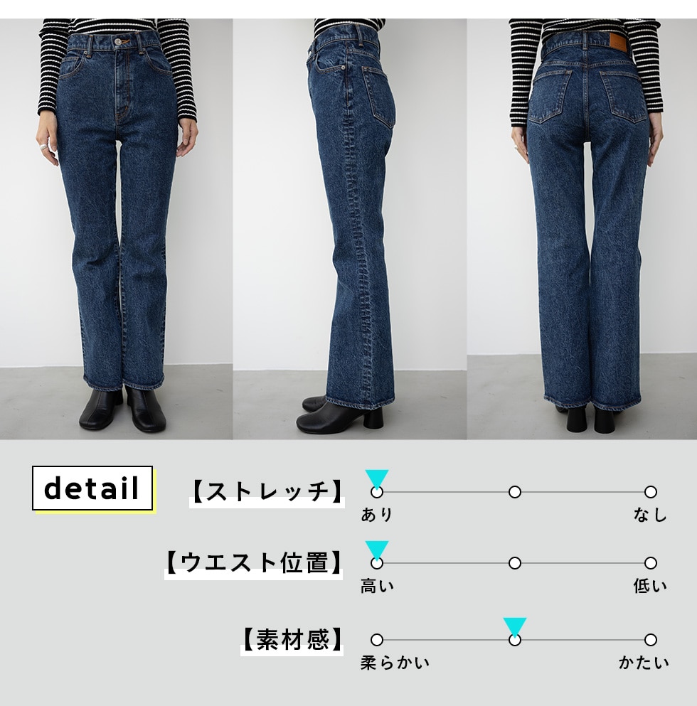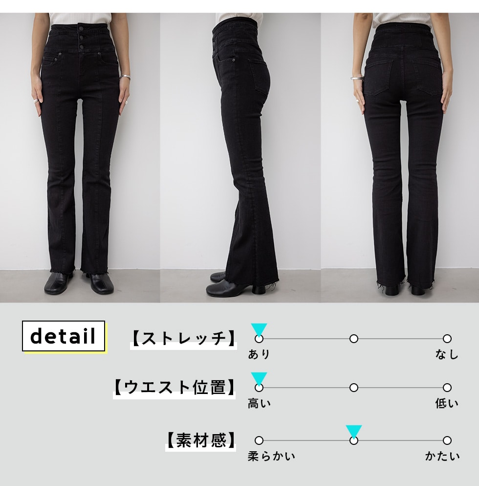 ウエストのボタンがアクセントになり、縦ラインを強調しスタイルアップ効果が狙える足長効果抜群のハイウエストデザインのフレアデニムです。