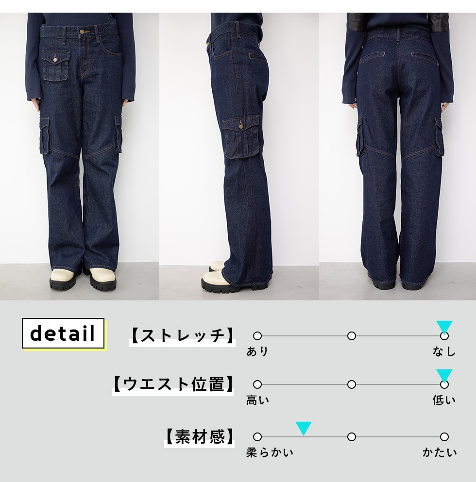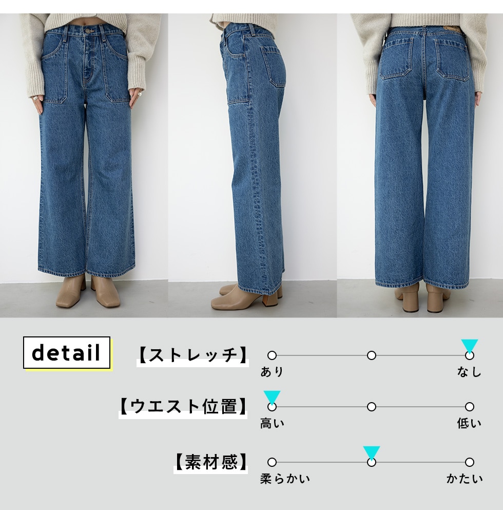 加工はヒゲ加工はあえて入れず、アタリのみで表現している為、癖が無く、シンプルなコーディネートにも合わせやすい1本になっています。