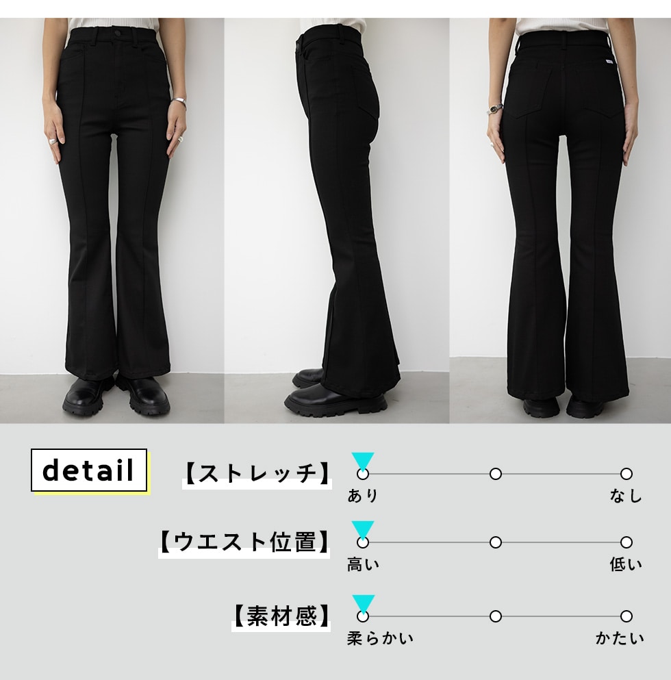 スタイルアップできるハイウエストに、膝の位置をやや上に設定することで、美しいフレアシルエットを実現しました。