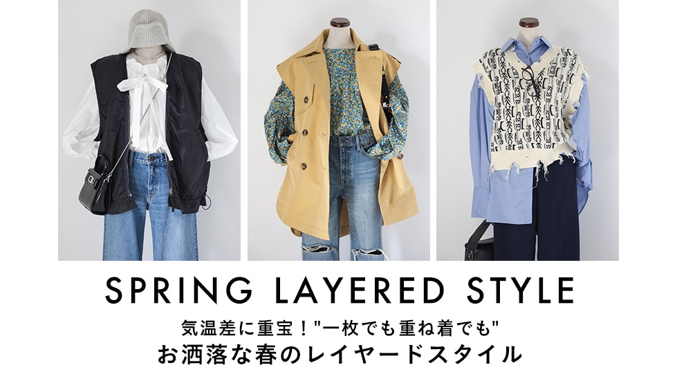 今の時期はベストで重ね着、暖かくなってきたらトップス1枚でお洒落に着こなせる春のレイヤードスタイルをご紹介。