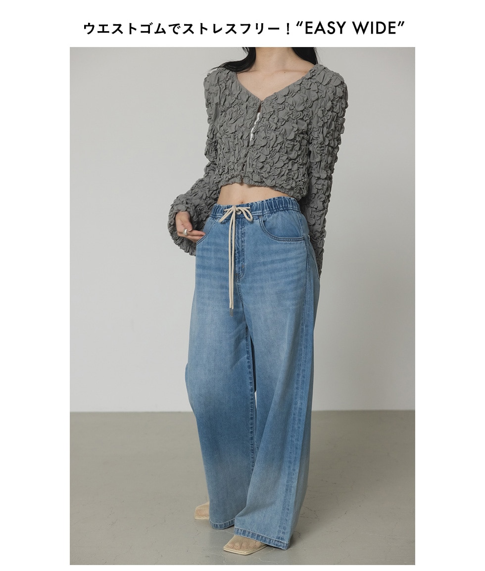 イージーに穿いて頂けるワイドなシルエットと、ウエストがゴム仕様でストレスフリーに過ごせるのも嬉しいポイントのデニム。トップスはコンパクトなアイテムを合わせてヘルシーな肌見せ。