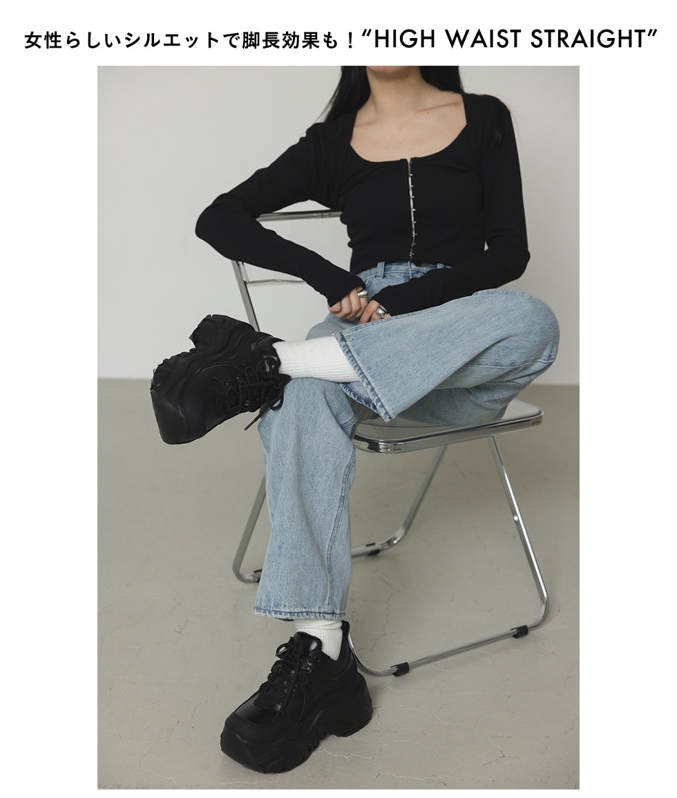 ハイウエストで程よいルーズ感のあるストレートシルエットは美脚効果も抜群!ユーズド感のある色落ちも可愛い。足元は、厚底でボリュームのあるテックスニーカーを合わせ、Y2K要素を強めて。