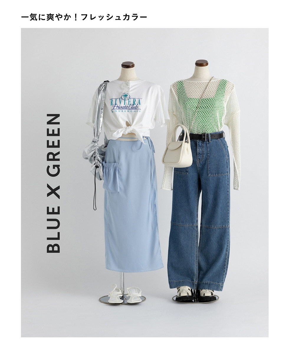 爽やかなアイスブルーやライムはそれだけで涼しげな印象を与える夏ならではのフレッシュカラー。濁りのないホワイトをベースカラーにすることでまとまりのある夏らしい涼し気なコーデの完成。