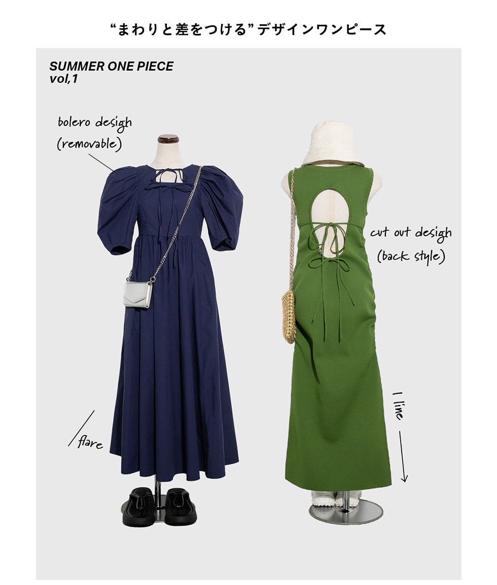 カットアウトディティールやボレロ風デザインは今年のトレンドを象徴するキーワードの一つ。デザインワンピースは一枚で着映えしてくれるので、ここぞというときに一着持っていると心強い味方に。