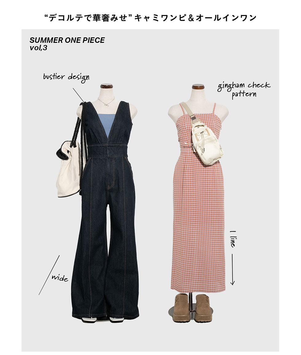 定番人気のキャミワンピース&オールインワン、今年はベアトップなど最小限のインナー使いでヘルシーかつ華奢見せがおすすめ。日焼け対策ならシャツを羽織ったりメッシュトップスを上にレイヤードしてみて。